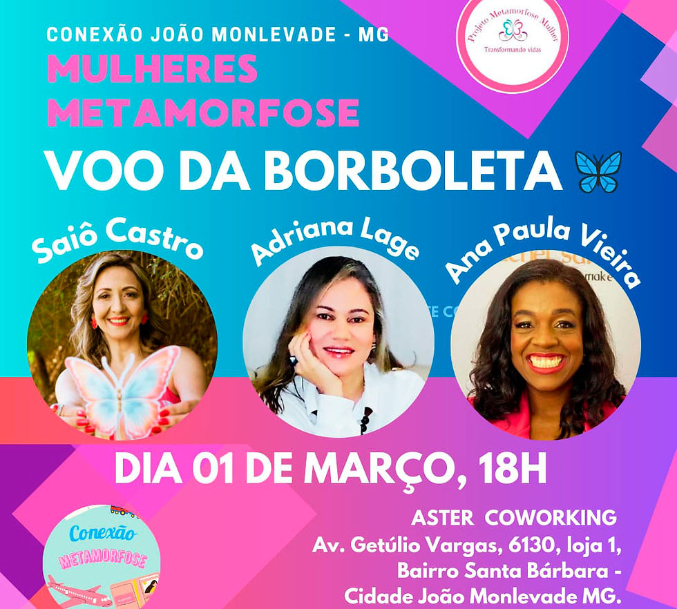 O Voo da Borboleta é um evento motivacional direcionado, principalmente, às mulheres que buscam pelo empoderamento feminino. Faz parte do ‘Metamorfose Mulher’ que tem na coordenação a empreendedora Saiô Castro.